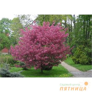 Описание: Декоративный вид яблони семейства Розовые. Высота: 6–8 метров. Цветки в бутонах темно-пурпуровые, при распускании — интенсивно-розовые или пурпуровые, на тонких, бело-войлочных цветоносах, что выделяет ее из общей массы цветущих яблонь. Плоды мелкие, одиночные, до 2 см, слегка шаровидные, с восковым налетом, фиолетово-пурпуровые, с розово-пурпуровой мякотью. Неприхотлива. Устойчива к вредителям и болезням. Растет относительно быстро.