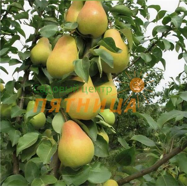 Описание: Дерево среднерослое, с округло-пирамидальной кроной средней густоты. Рост: в среднем — 2,5 м. Плоды крупные (до 300 г), правильной широкогрушевидной формы. Кожица гладкая, зеленовато-жёлтая с ярким пурпурным румянцем на большей части плода. Мякоть белая, нежная, без грануляций, сочная, кисло-сладкая, ароматная. Съёмная зрелость наступает в конце августа.
