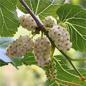 Описание: Дерево достигает до 4м в высоту, формирует густую крону по типу шатра. Ягоды длиной до 5 см., состоят из многочисленных костянок и собирающиеся в колоритные букеты. Оттенок плодов может варьироваться от белого до золотистого. Постепенное созревание гарантирует долгую урожайность (полтора-два месяца), а само дерево за свою является бесспорным претендентов на звание жемчужины сада. Садоводы предпочитают сорт по многим причинам, включая возможность использовать его для поддержания здоровья. В ход идет все: плоды, листья и даже кора. Настои, соки и отвары шелковица Медовая Белая обладают выдающимися целебными свойствами в борьбе за сильный иммунитет, красоту, качество зрения, оптимальный обмен веществ и нормализацию артериального давления. приживается на любых почвах; - устойчива к засухам и морозам; - растет быстро и обильно плодоносит.