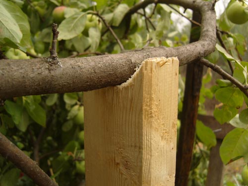 Например доске вырезаем небольшое углубление под диаметр подпираемой ветки, можно это углубление застелить кусочком рубероида или куском резины от старой покрышки (или чем-то подобным, например кусок резинового шланга разрезанного с одной стороны) чтобы ветке было мягче упираться на опору, а внизу к нашей опоре прикрепляем еще досточку поперек, так чтобы с низу она получилась буквой "Т" для большей устойчивости и подпираем нашей конструкцией нужную веточку.