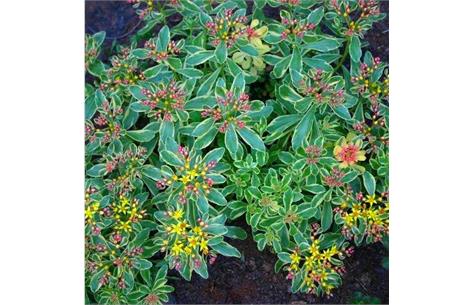 Описание: Высота - 15см. Отличается кремово-окаймленными листьями. Период цветения: Июнь-сентябрь. Цветки желто-оранжевые, в щитковидных соцветиях. Место: Солнце. Почва: Любая сухая, водопроницаемая. Засухоустойчивые. Сочетается: Камнеломка, лапчатка золотистая, раулия. Применение: Альпинарии, рокарии, бордюры.