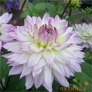 Описание: Георгина Крейзи Лов. Однолетнее клубневое растение группы Декоративных георгин. Куст мощный, пышный, стебли полые высотой 90 см. Листья перистые, темно-зеленые, многочисленные. Соцветие махровое, белое с тонкой сиреневой каймой и нежно-сиреневыми кончиками. Лепестки плоские, по краю заостренные. Диаметр цветка – 10-15 см. Высаживают в конце мая - начале июня, когда минует опасность заморозков. Расстояние между растениями при посадке 30-40 см и 5-7 см над клубнем. Предпочитает солнечные места, защищенные от ветра, плодородные хорошо дренированные почвы. Используется для групповых посадок и на срезку. Цветет с июля по октябрь. Устойчива к неблагоприятным условиям роста, к болезням и вредителям.