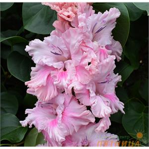 Описание: Грациозный цветок с очень нежно-розовыми лепестками, украшенными рисунком из изящных темно-розовых прожилок. Оригинальная «кудрявая» гофрировка придает соцветию пышность и воздушность. Пропорциональный колос из 20-23 бутонов на прочном стебле. 10 из них могут быть открыты одновременно. В отличие от многих гофрированных сортов отечественной селекции, все бутоны направлены в одну сторону и располагаются всегда в одной плоскости. Высота 150 см.