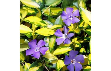 Описание: Вечнозелёный почвопокровный полукустарник семейства Кутровые. Образует густой ковёр из глянцевых кожистых тёмно-зелёных листьев с золотистой каймой. Высота: 10–15 см. Побеги: стелющиеся, длиной 45 см. Легко укореняется в узлах побегами высотой до 1 см. Цветки: пурпурно-синие. Цветение: в мае-июне. Используют для быстрого прикрытия пустых, «лысых» зон, склонов и пространств между деревьями.