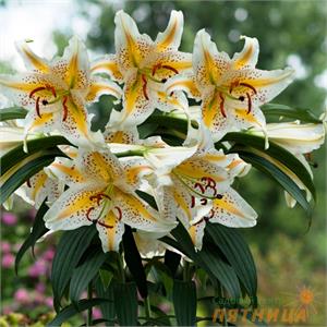 Описание: Отличает эту группу прежде всего большой размер цветов. И эта разновидность не исключение. Немахровые цветки рассматриваемого сорта довольно крупные, диаметр каждого достигает 25 см, отличаются интересным эффектным окрасом. На фоне снежно-белого поля наблюдается крупная золотисто-оранжево-жёлтая полоса, которая идёт от самой сердцевины до конца лепестка. Цветок покрыт ярким крапом тёмно-красного оттенка, пыльники растут вверх, они имеют красно-коричневую расцветку. Насыщенность окраса яркая. Стебель у лилии крепкий, прямостоячий, листва крупная, полностью покрывает стебель. Высокорослый куст вытягивается до 160 сантиметров. Цветки на стебле ориентированы в стороны. Сорт имеет насыщенный, сильный и стойкий аромат. На одном месте его можно выращивать несколько лет.
