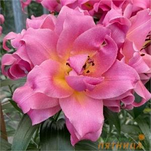 Описание: Махровая, сиренево-розовый с желтым центром, лепестки изящно загибаются, 22см, высота -115 см.