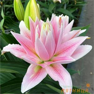 Описание: Цветок — густомахровый, кремово-розоватый с розовым напылением вдоль центра лепестков. Высота — 130 см.