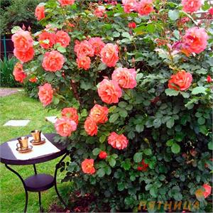 Описание: Цветки крупные, полумахровые, с волнистыми лепестками, появляются в больших рыхлых кистях по 5-10 шт. Рано начинает цвести и цветет повторно до поздней осени. Каждая волна цветения очень длительная, так что куст редко стоит без цветов. Листва удлиненная, темная, устойчива к заболеваниям и хорошо оттеняет яркие цветки. Куст сильнорослый, прямостоячий, хорошо разветвленный и довольно колючий. 150-180см.