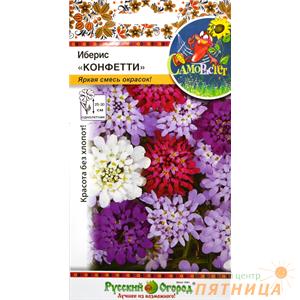 Описание: Иберис Конфетти – самая полная смесь, состоящая из разных цветовых сочетаний. Белые, розовые, лиловые и пурпурные соцветия, источающие сладостны аромат, хорошо будут смотреться как в цветниках, так и на альпийских горках или вазонах. Иберис создан, именно для тех, кому не хочется много ухаживать за цветами, зато хочется как можно дольше любоваться разноцветным ландшафтным дизайном садовых клумб. Высота ибериса не превышает 35 см, а значит это будет отличная база, как для нового цветника, так и для того, чтобы вдохнуть новую жизнь в старый. Хочется также отметить, что растение очень редко болеет и очень быстро разрастается. Если в ваши планы не входит увеличение площади ибериса – посадите его в заранее заготовленный горшок, который не позволит корням разрастаться. Иберис Конфетти будет красиво смотреться на альпийских горках или подпорных стенках. Его можно дополнить фиолетовыми, голубыми или нежно-розовыми цветами. Растение предпочитает песчаные почвы, которые как раз обеспечиваются каменным дизайном рокариев или альпинариев. Подкормки можно не использовать, хотя зачастую садоводы вносят удобрения в ранний весенний период. Цветение может продолжаться до начала заморозков, поэтому рядом с астрами, кореопсисами и даже безвременниками иберис смотрится великолепно. Единственное правило – почву вокруг него не следует переувлажнять. Поэтому поливайте его нечасто, а по мере просыхания верхнего почвенного слоя. Также, выбирая для него местоположение, обращайте внимание на возвышенности, а не на низменные участки.