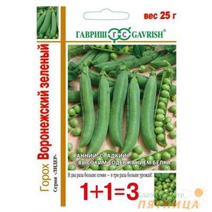 Описание: Раннеспелый (42-54 дней от полных всходов до технической спелости горошка) сорт овощного гороха. Растение полукарликовое. Стебель темно-зеленый с восковым налетом, без опушения, высотой 70-90 см. Боб лущильный, остроконечный, слабоизогнутый, зеленый, 8-10-семянный. Горошек изумрудно-зеленый, с высоким содержанием белка и нежным сладким вкусом. Созревание плодов дружное. Сорт рекомендуется для употребления в свежем виде, консервирования и замораживания. Вкусовые качества свежего и консервированного горошка хорошие. Урожайность 0,8-1,2 кг/м2. Посев производят в открытый грунт ранней весной на солнечной стороне участка на глубину 4-6 см. Схема посева: 15x30 см. Растения нуждаются в опоре.